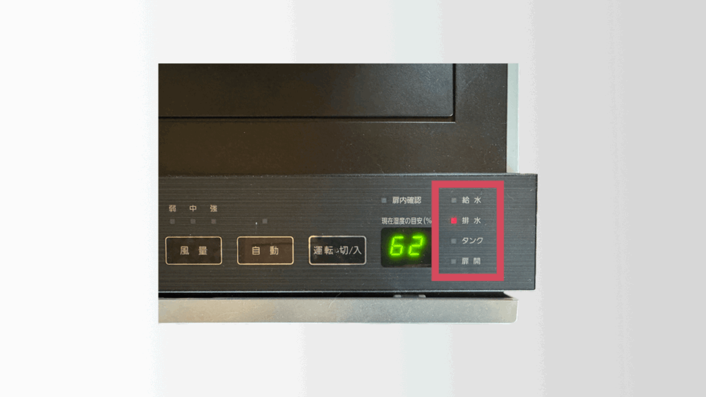 筆者の機種は給水タンクを取り付けたら排水ランプが消えるタイプのものでした!